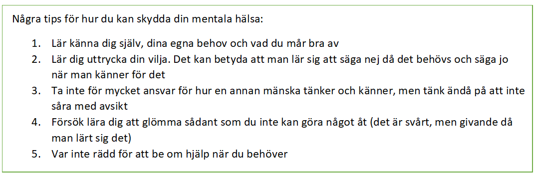 Att lära sig att skydda sin mentala hälsa betyder alltså att man lär känna sig själv och vad man behöver för att må bra. Är det idrott, vila, en skogspromenad, skriva dagbok, läsa, kompisar, lek eller kanske en kram eller två av en familjemedlem? Känn efter.